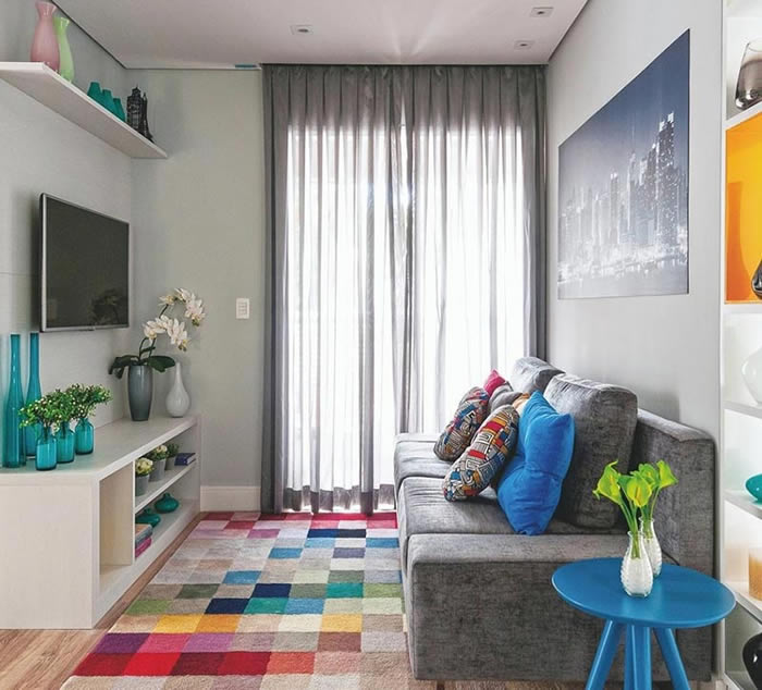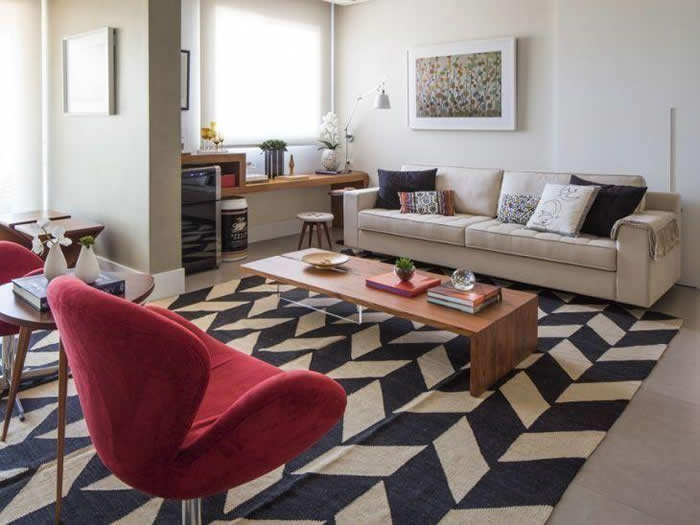 Os tapetes podem servir também para delimitar espaços ou até dar a sensação de maior amplitude (no caso de tapetes grandes) ou ambiente pequeno (quando não encostam nos sofás). De algodão, lã, fibras naturais, o importante é que se sinta bem e estes sejam resistentes à quantidade de pessoas que passam na sua sala.