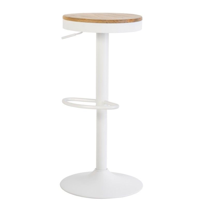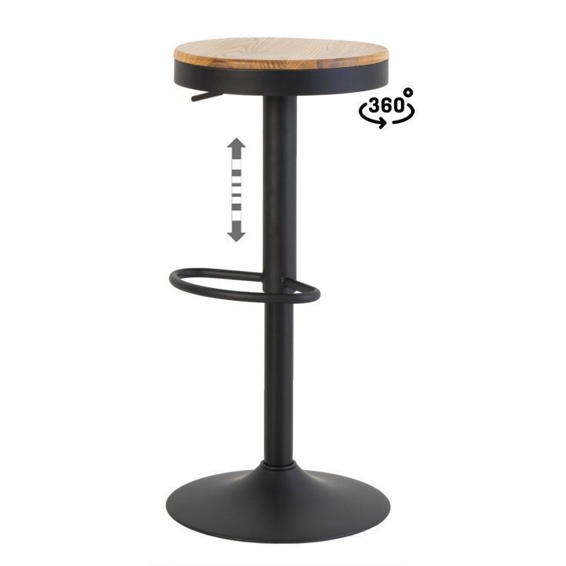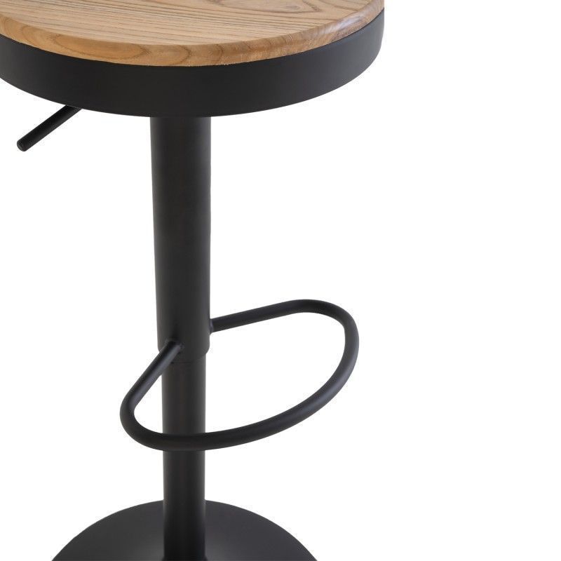 Banco com assento em madeira e estrutura em metal, giratória e regulável em altura.