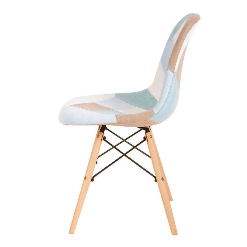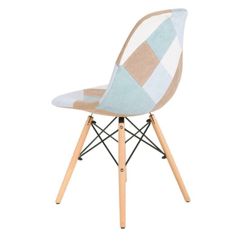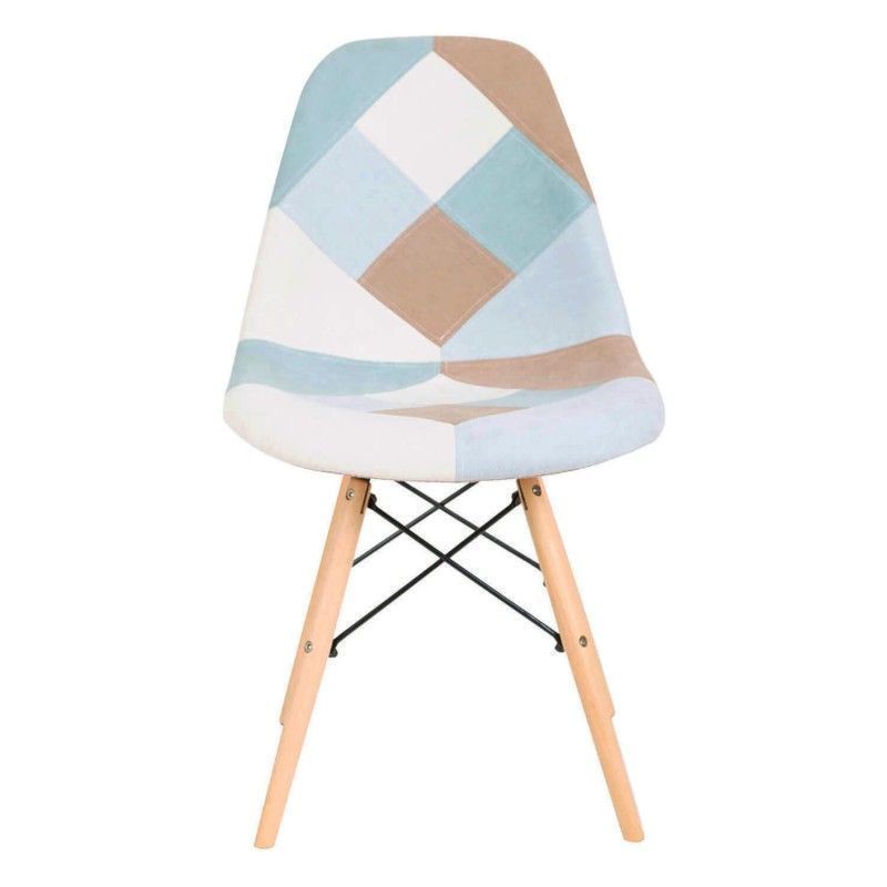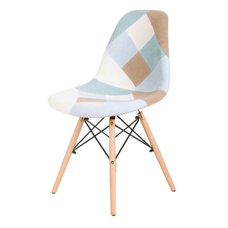 Cadeira patchwork em tom pastel, com predominância das cores azul/mostarda e cinza.