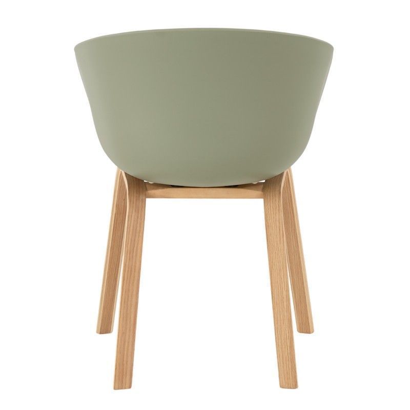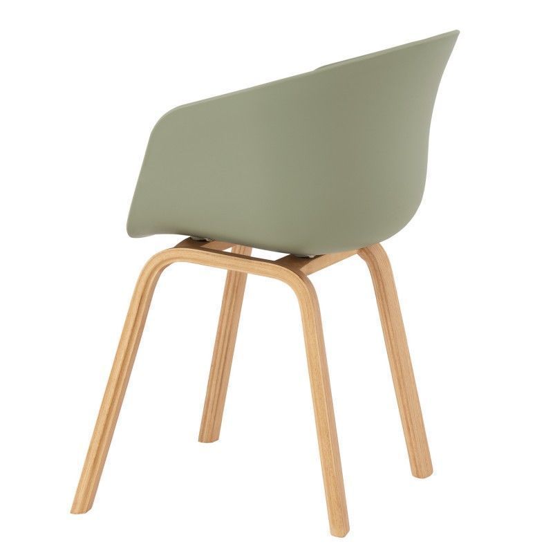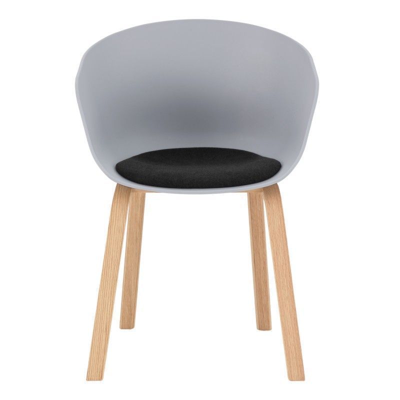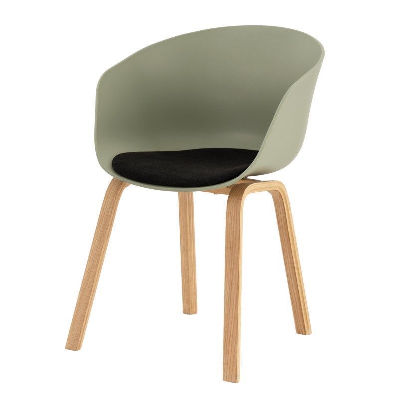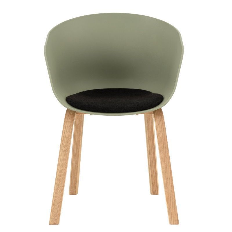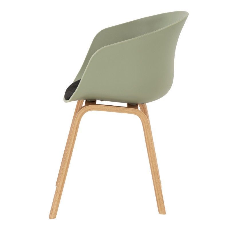 Cadeira com pernas curvas em compensado e assento ergonómico em polipropileno que inclui almofada estofada para maior conforto.