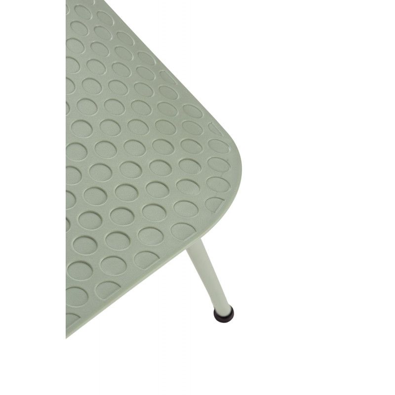 As pernas são metálicas e da mesma cor do assento.