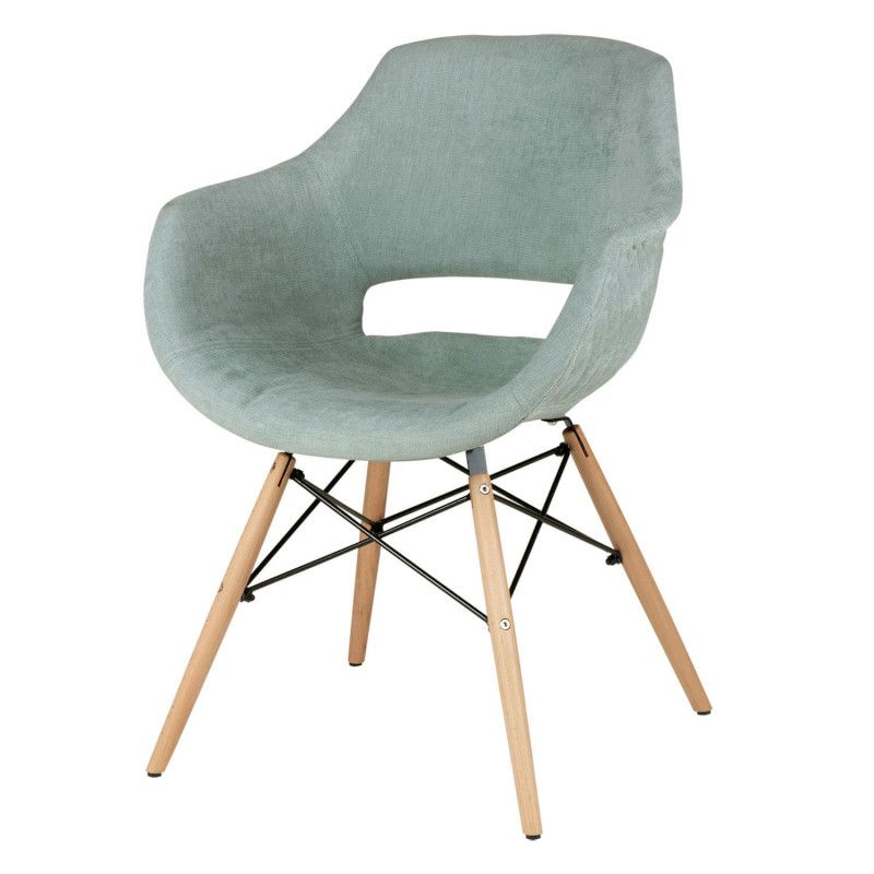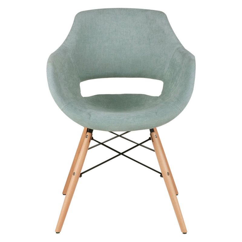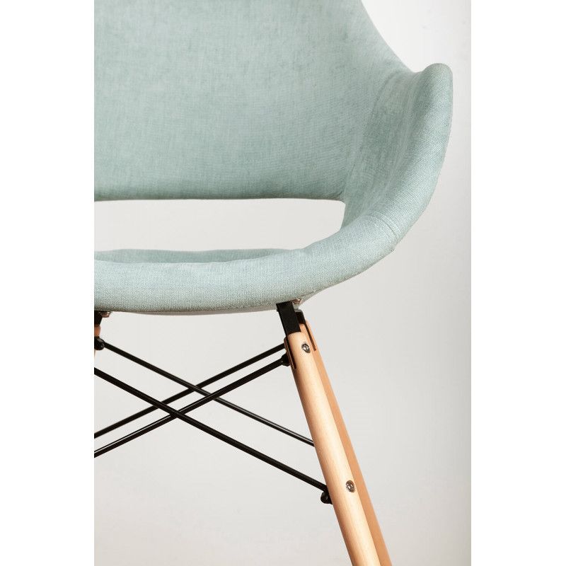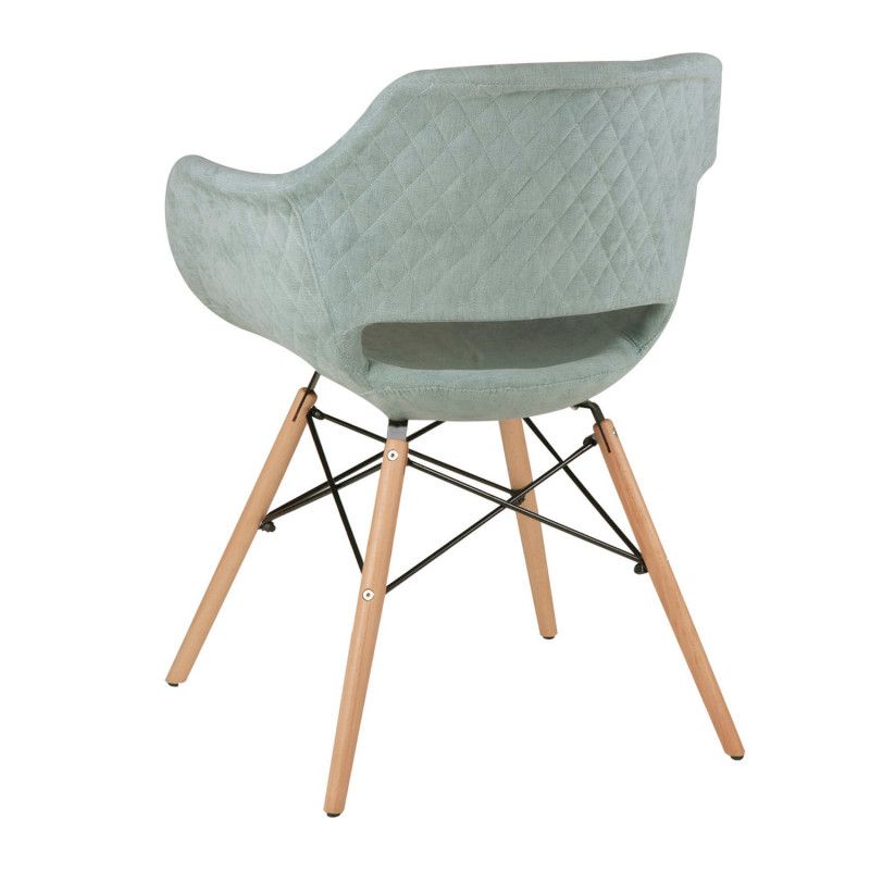 Cadeira estofada de estilo nórdico em forma de poltrona com tecido liso com diversas cores disponíveis na frente e tecido em forma de diamante no verso.