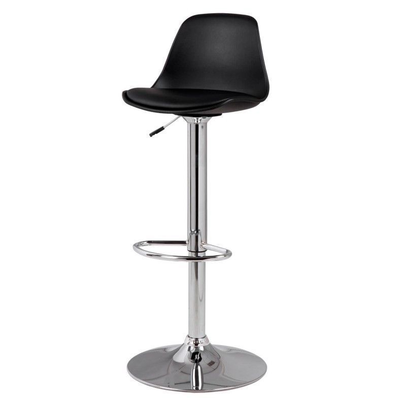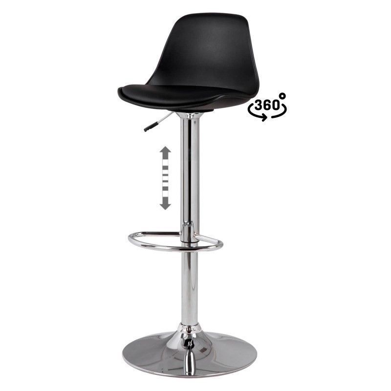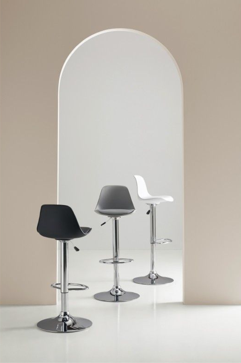 Banco cromado regulável em duas alturas e com apoio para os pés. Assento curvo em polipropileno com estofamento em PU. O sistema de elevação do pistão.