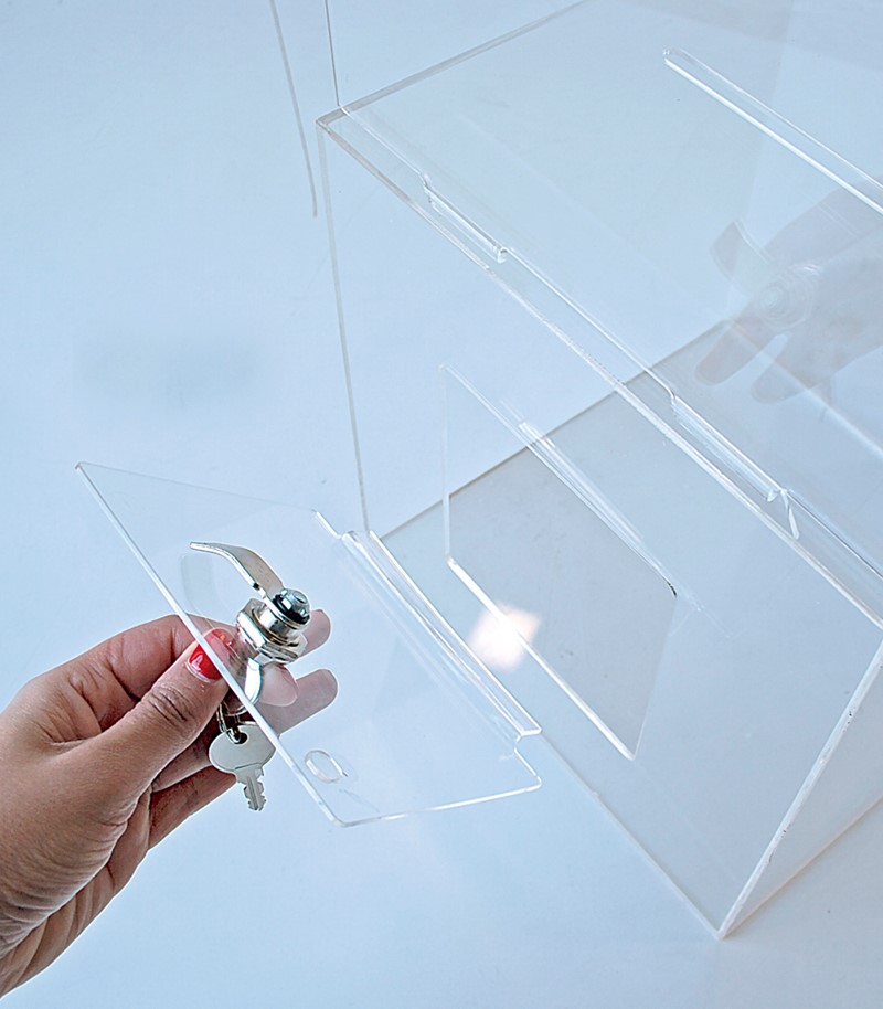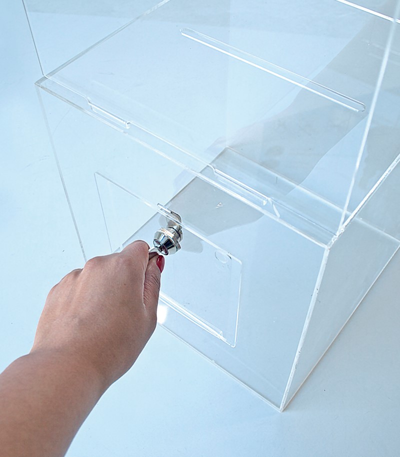 Esta caixa traz uma fechadura e respectiva chave. De cor transparente, é um expositor leve, fácil de aplicar produção e de manusear.