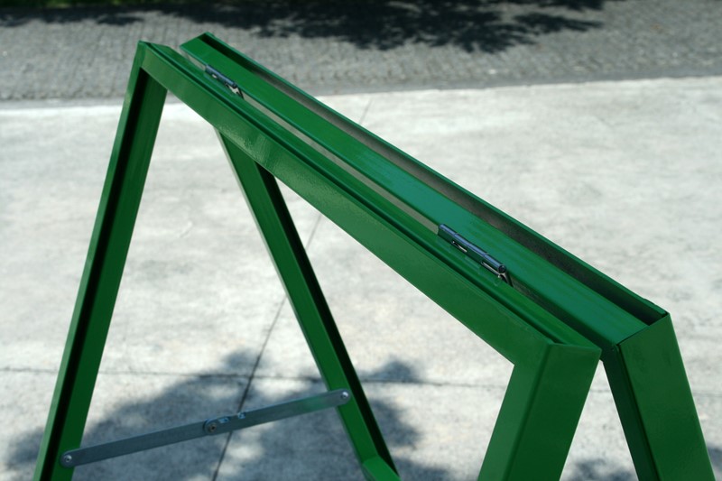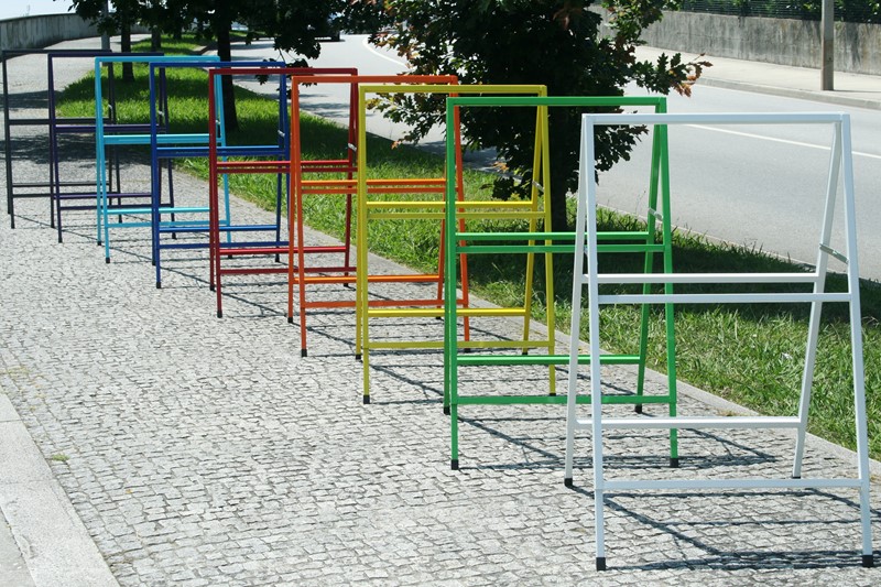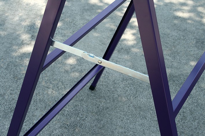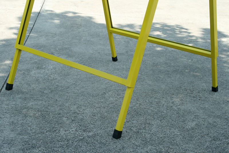 O Cavalete Metal está disponível em 5 cores diferentes: laranja, amarelo, vermelho, roxo e verde. As suas dimensões totais são de 71 cm x 120 cm e a sua área de comunicação gráfica é de 707mm x 1000mm.