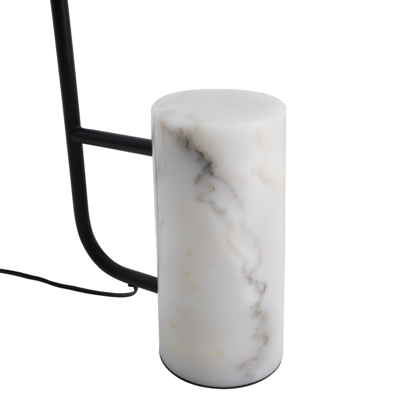 Candeeiro de pé com estrutura em metal preto e base em mármore.