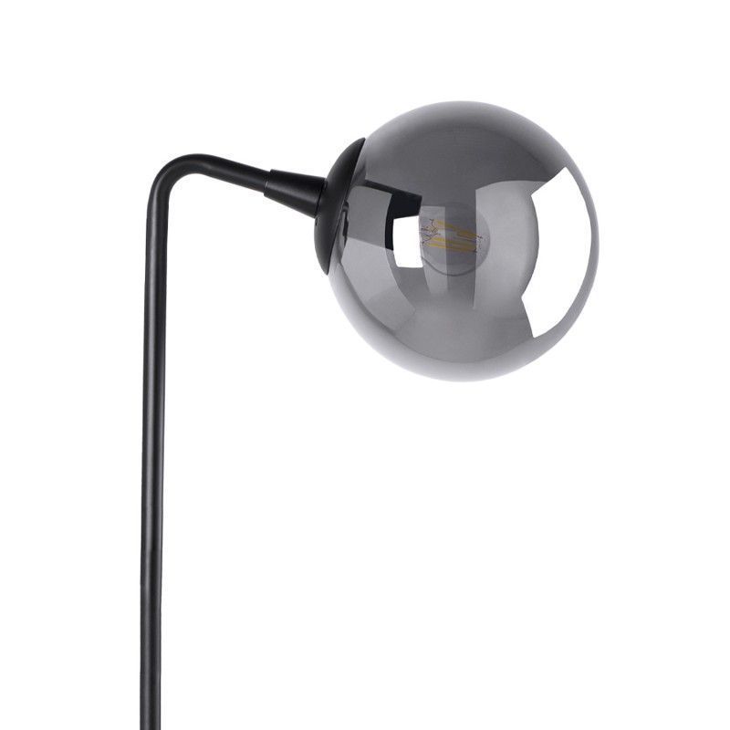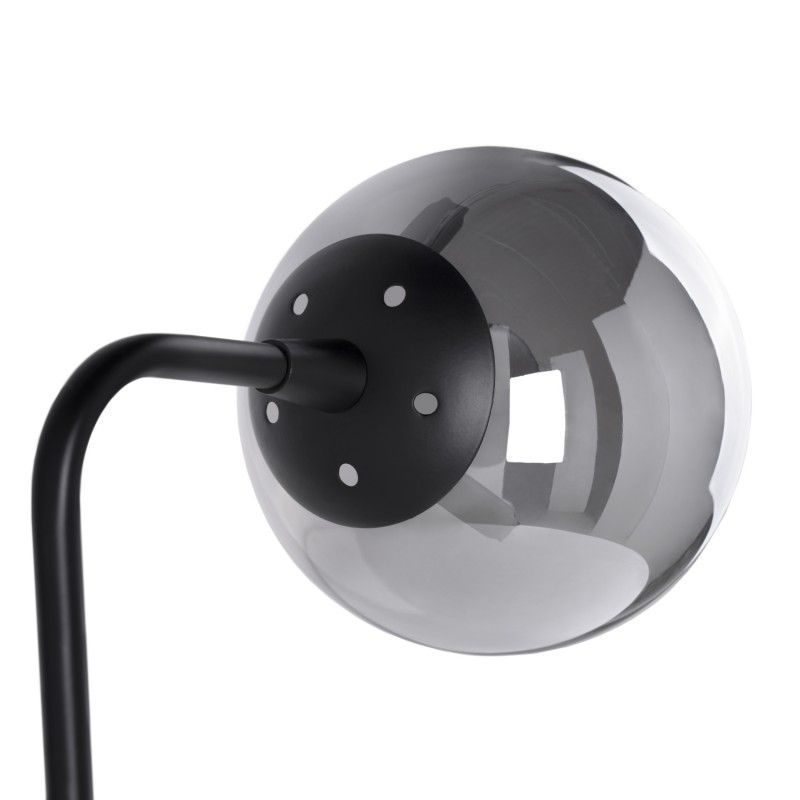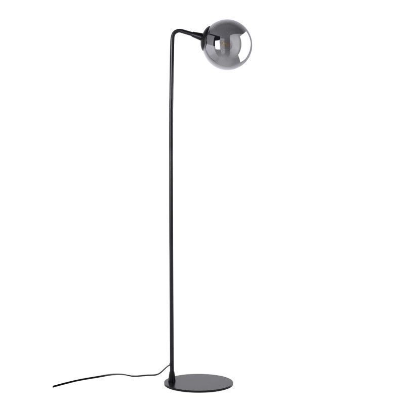 Candeeiro de pé com estrutura metálica preta e abajur de vidro.