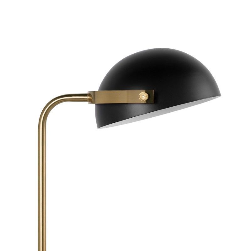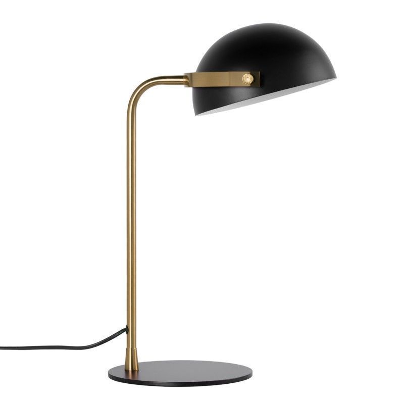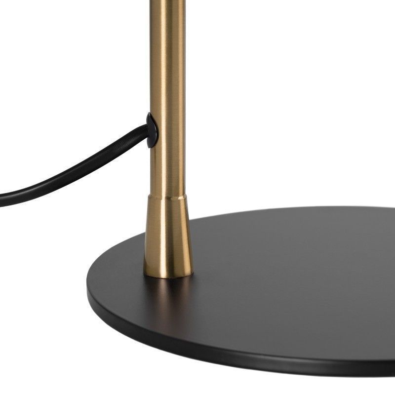 Candeeiro de mesa de design moderno com estrutura em metal preto e detalhes dourados.