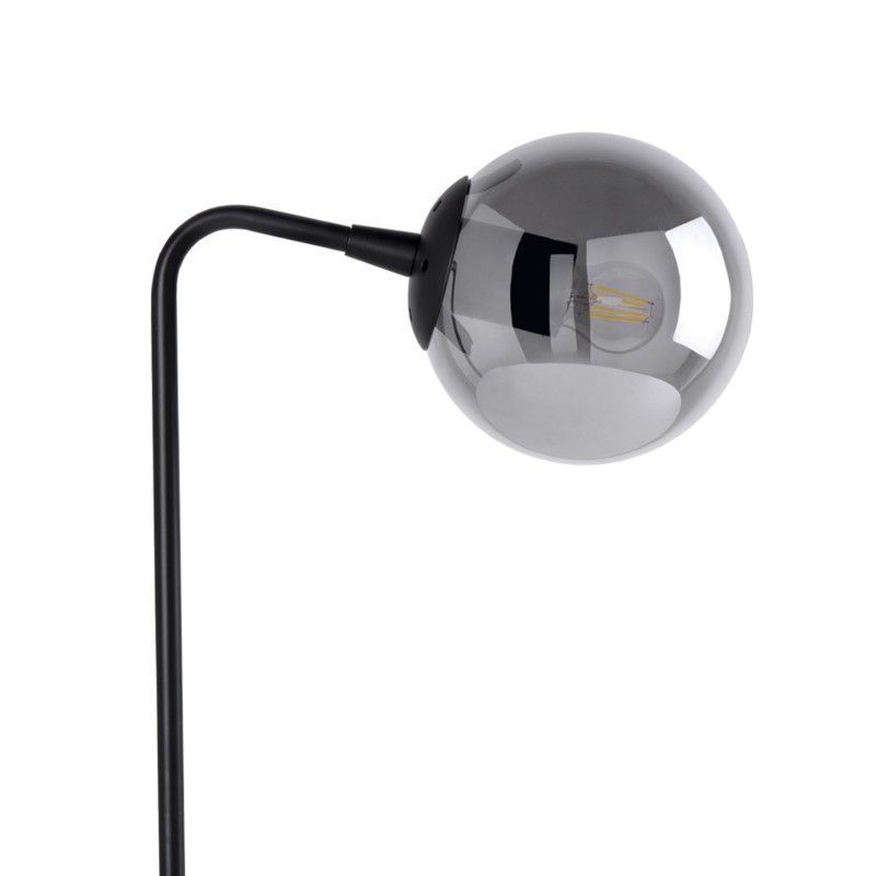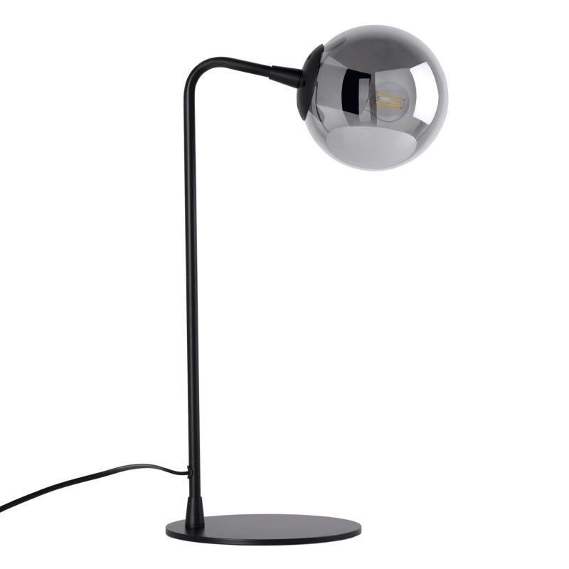 Candeeiro de mesa com estrutura em metal preto e abajur redondo.