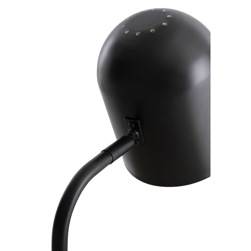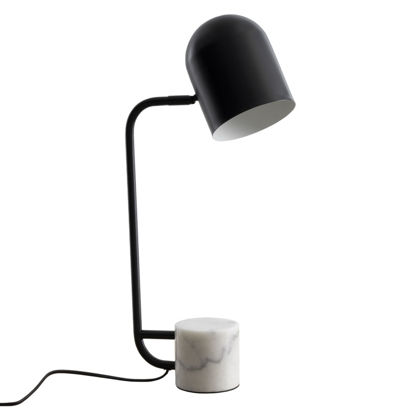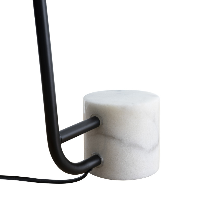 Candeeiro de mesa com estrutura em metal preto e base em mármore.