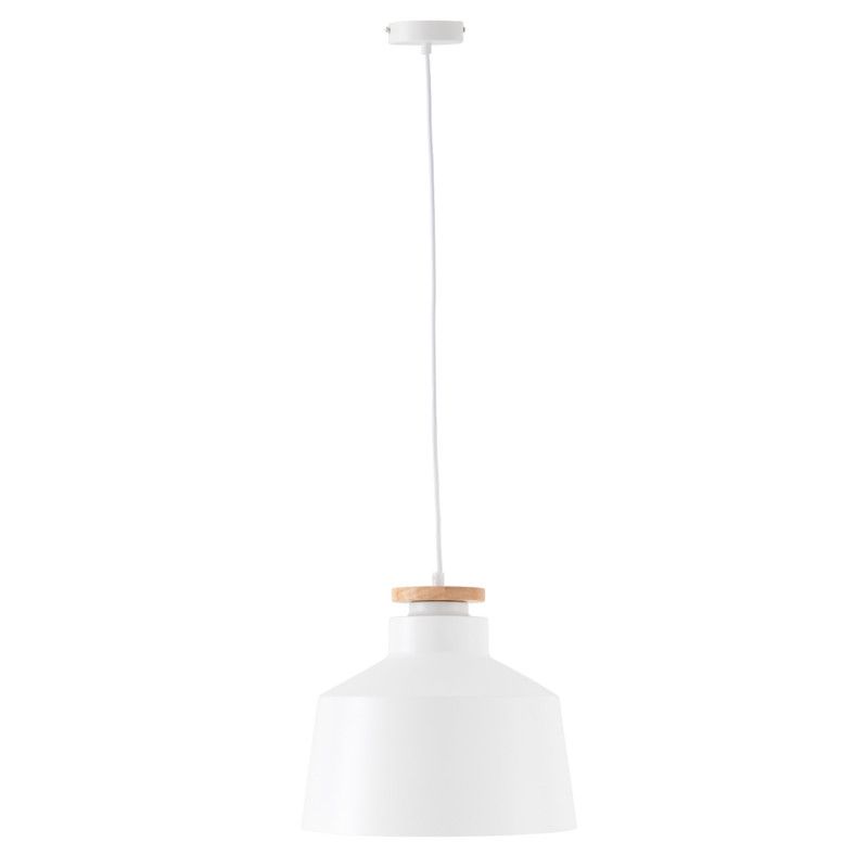 Luminária de teto em alumínio branco fosco com placa de madeira com design básico adequado para diferentes ambientes.