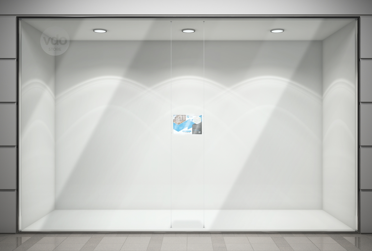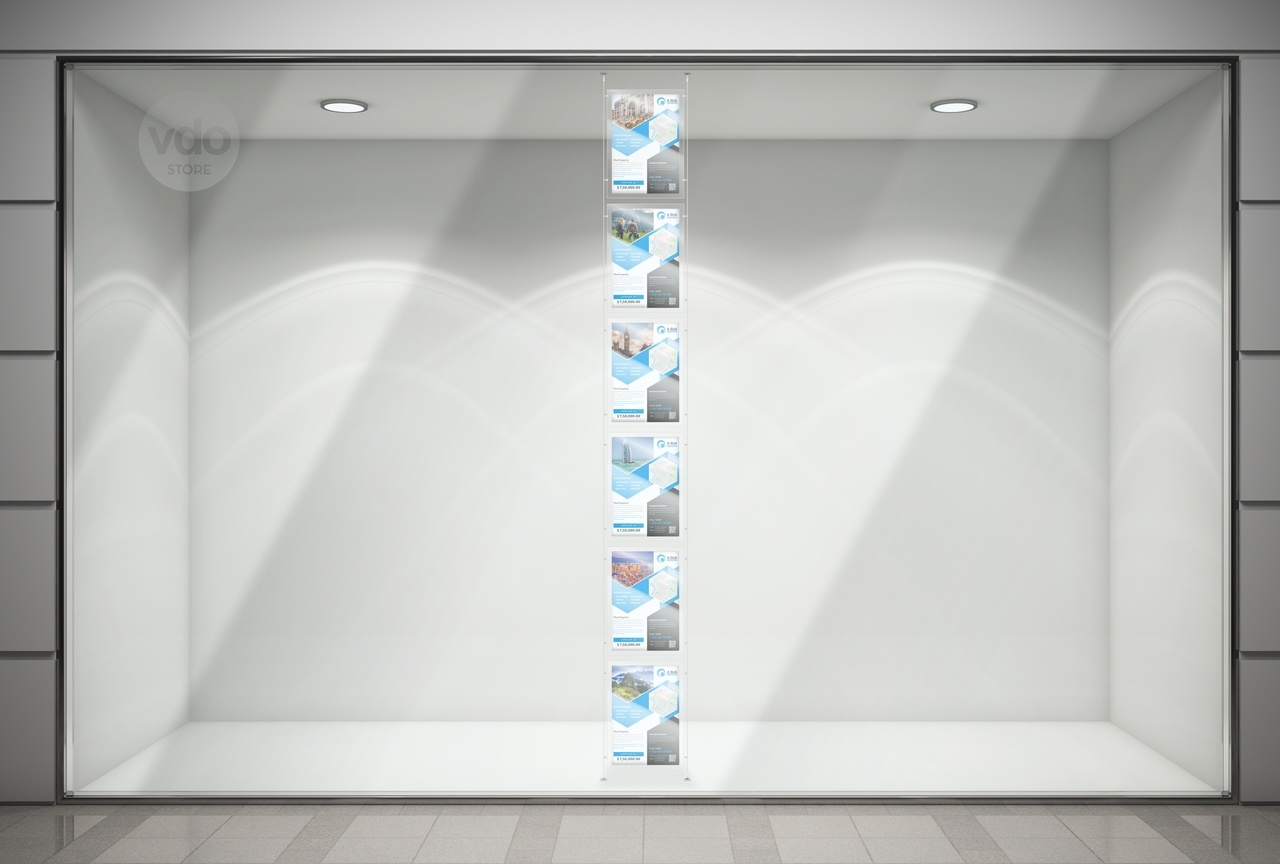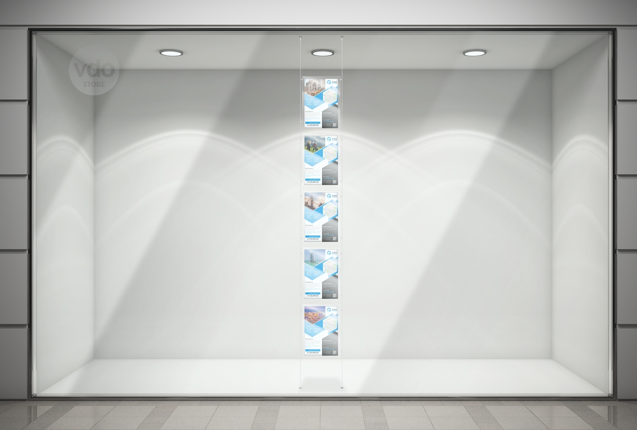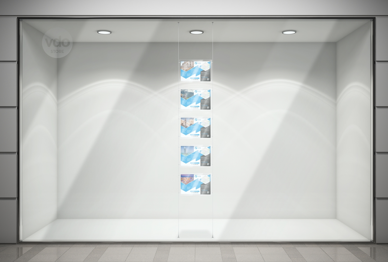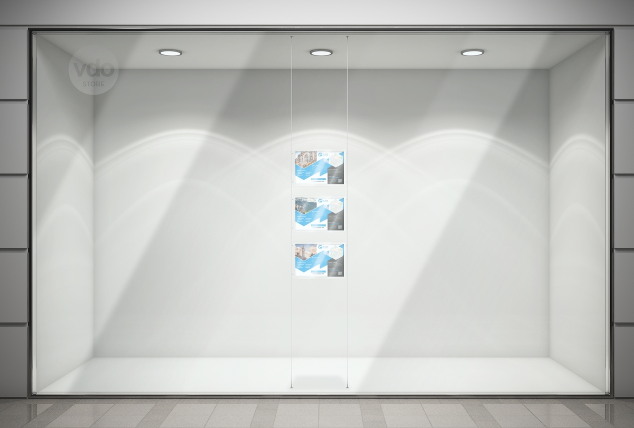 Painel em acrílico transparente, disponível com orientação vertical ou horizontal, para inserção de grafismo. Desenho próprio para poder estar fixo aos cabos de aço e ao mesmo tempo permitir que se mude o conteúdo.