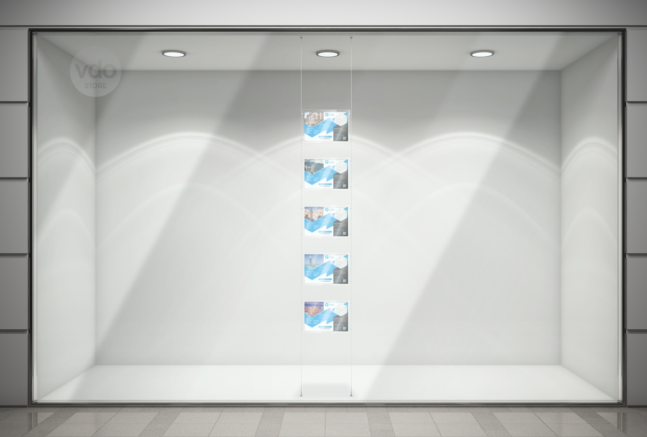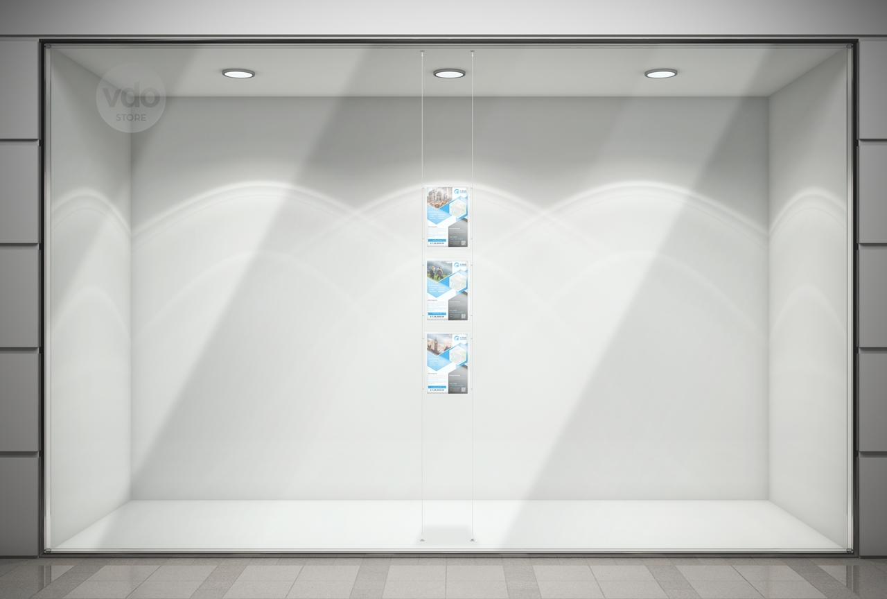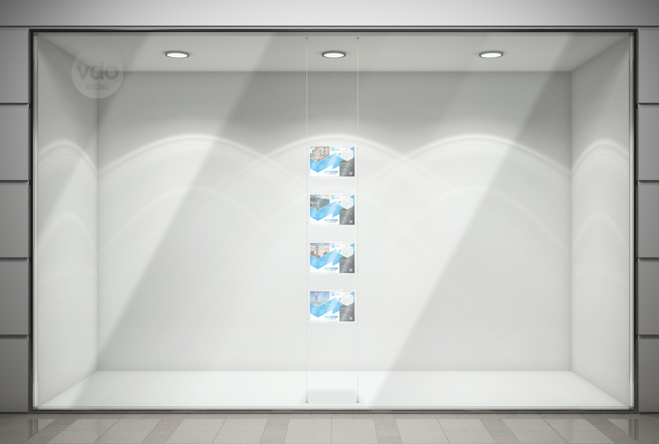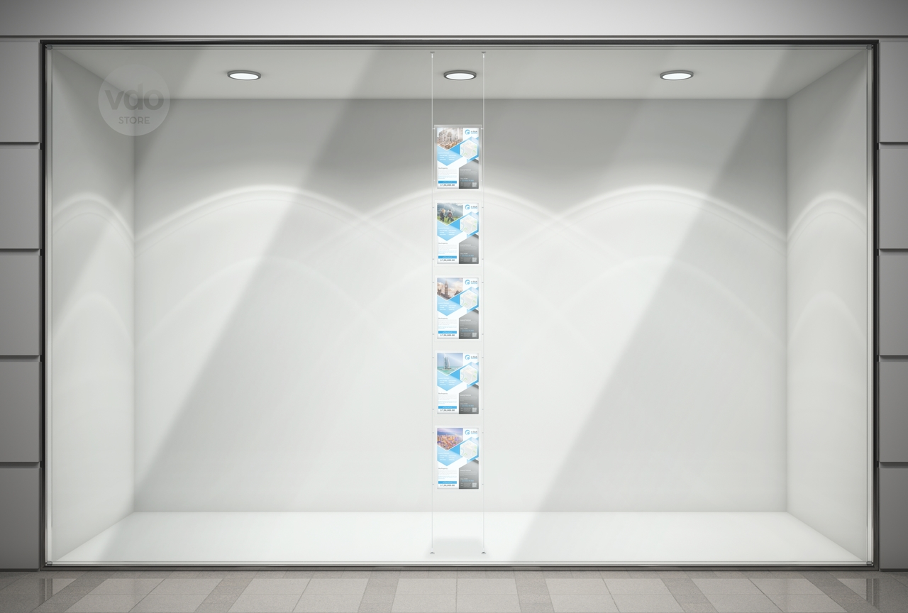 Painel em acrílico transparente, disponível com orientação vertical ou horizontal, para inserção de grafismo. Desenho próprio para poder estar fixo aos cabos de aço e ao mesmo tempo permitir que se mude o conteúdo.