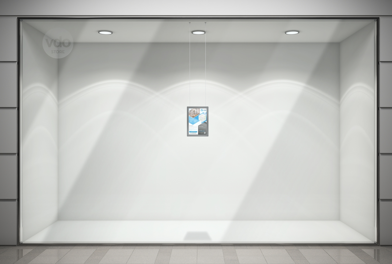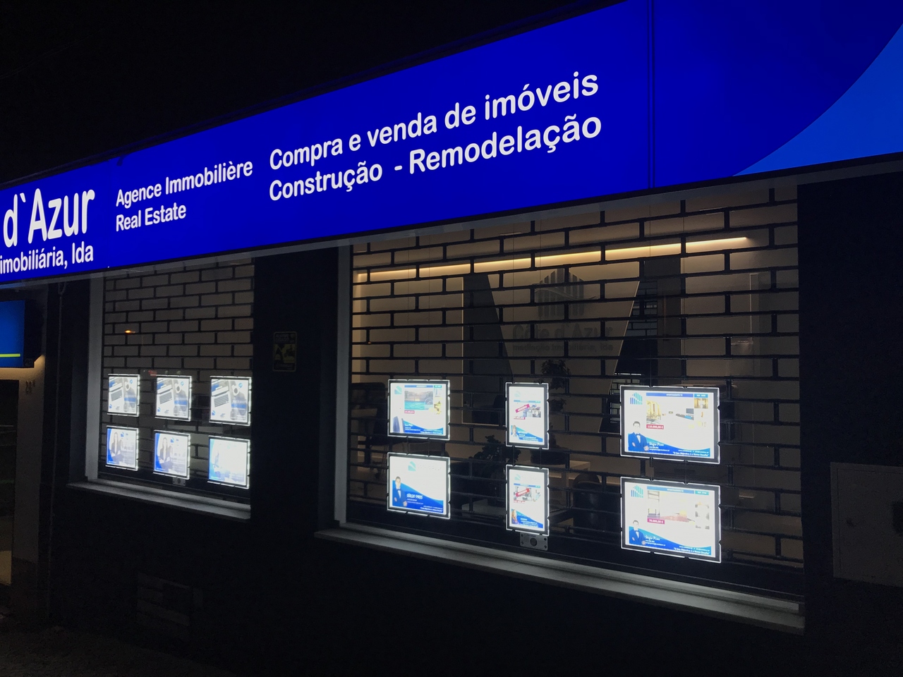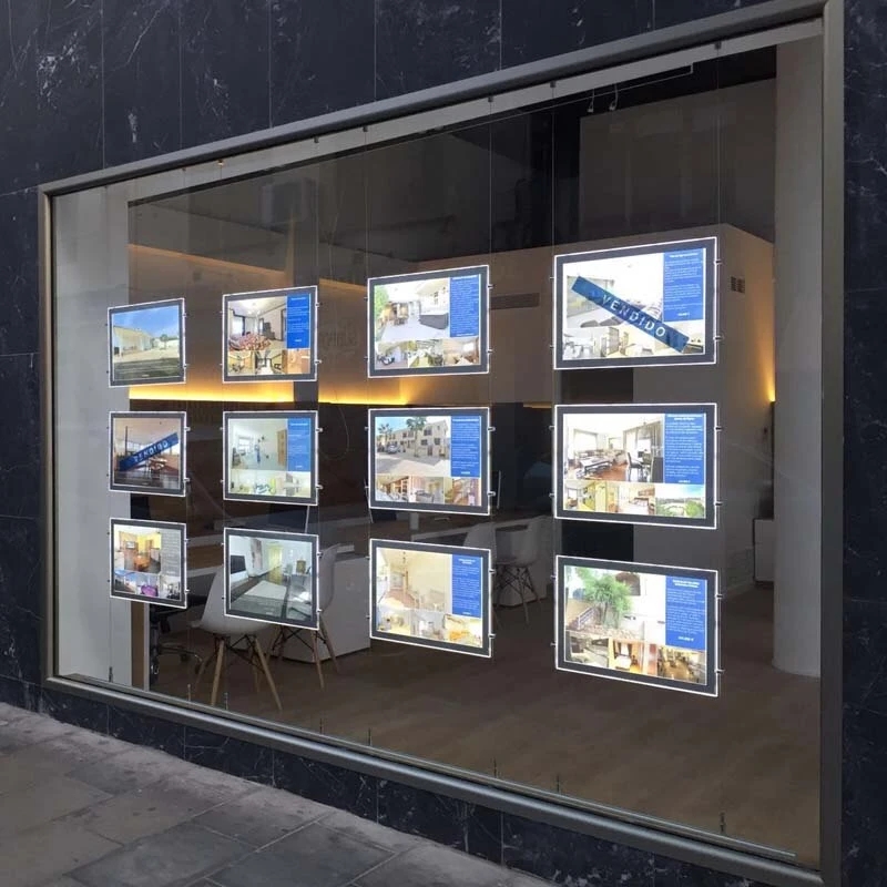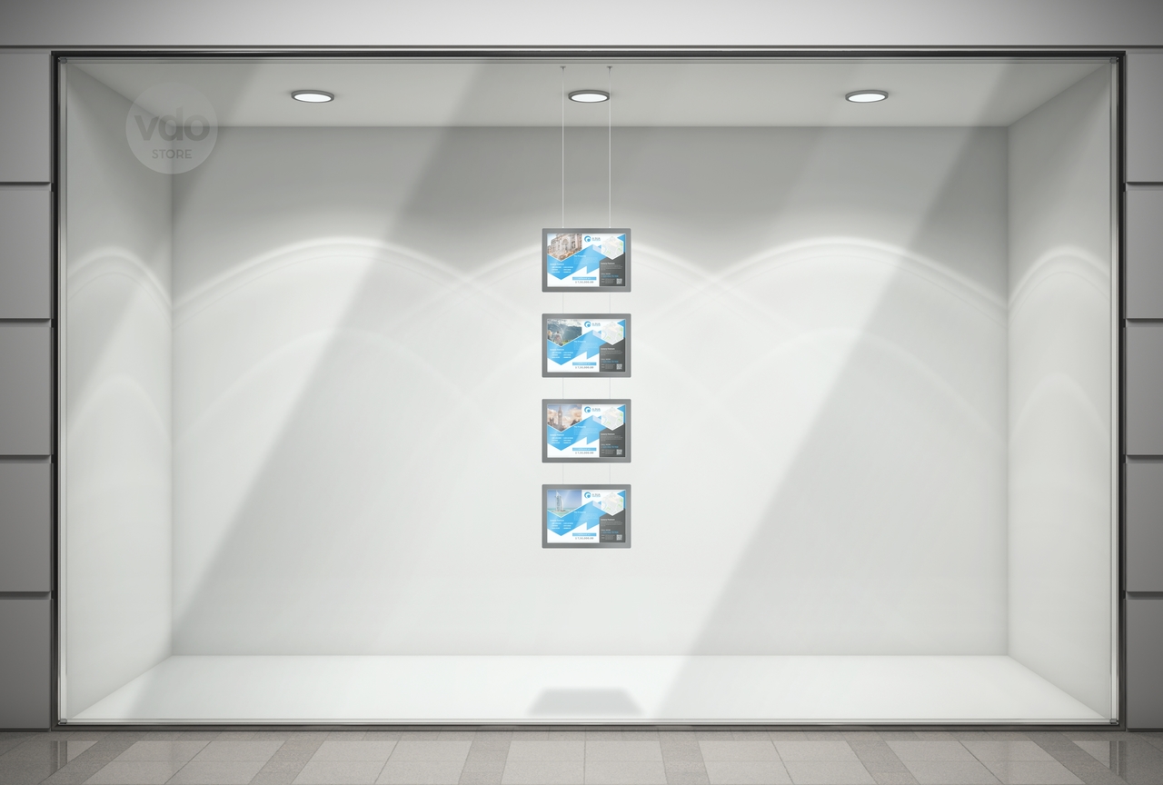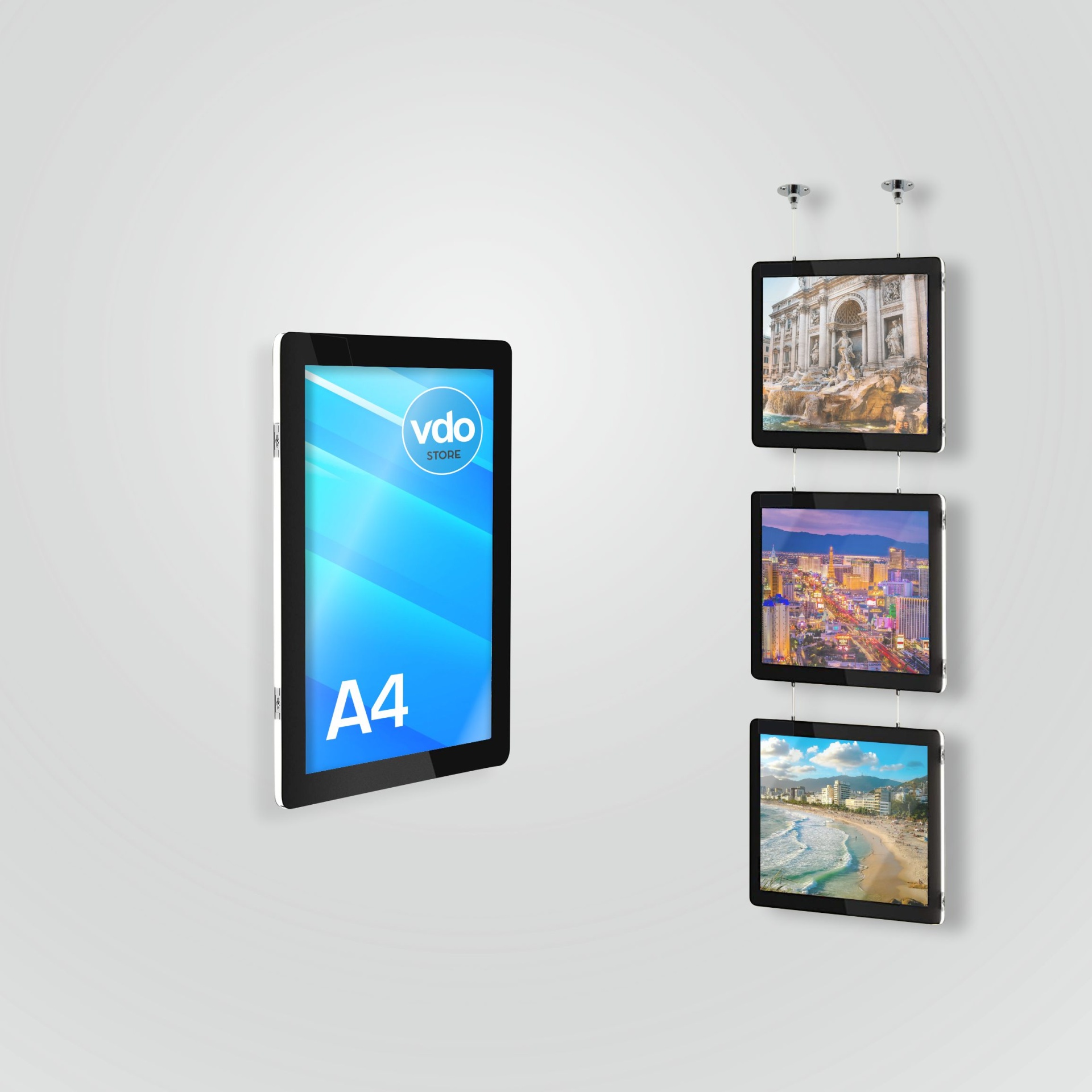 Suporte de posters com um design elegante e minimalista. Este expositor LED tornou-se essencial para montras iluminadas.
