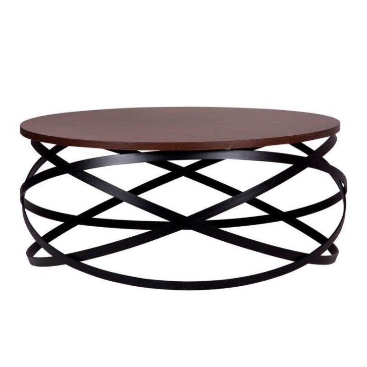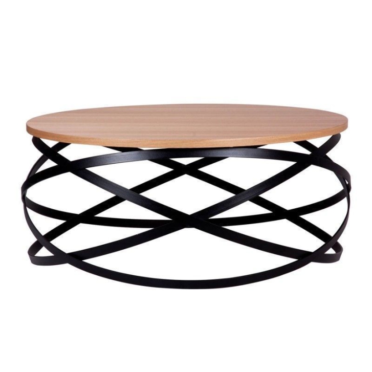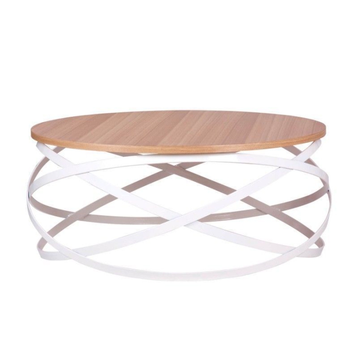 Mesa de centro de grande capacidade, com estrutura em metal e tampo em folheado de diversas madeiras disponíveis.