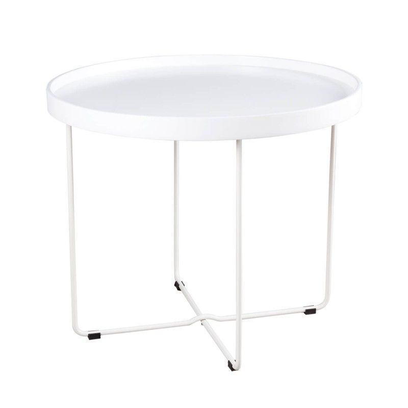 Mesa de centro redonda em metal branco, com tampo DM de 40mm de espessura lacado a branco e com um design muito moderno em forma de tabuleiro.