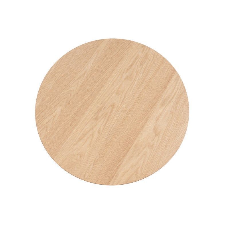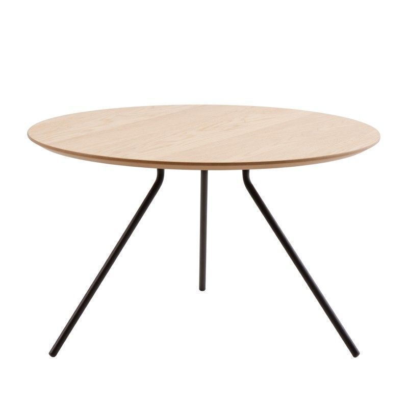Mesa de centro redonda em carvalho com folheado natural e pés em metal preto.