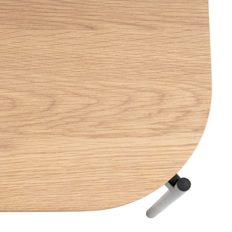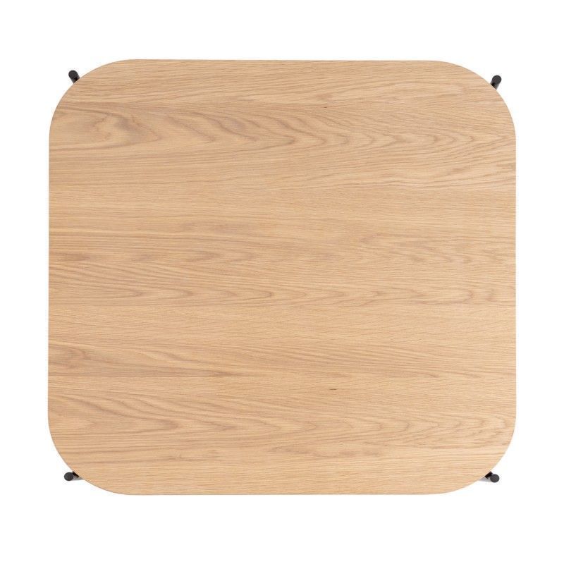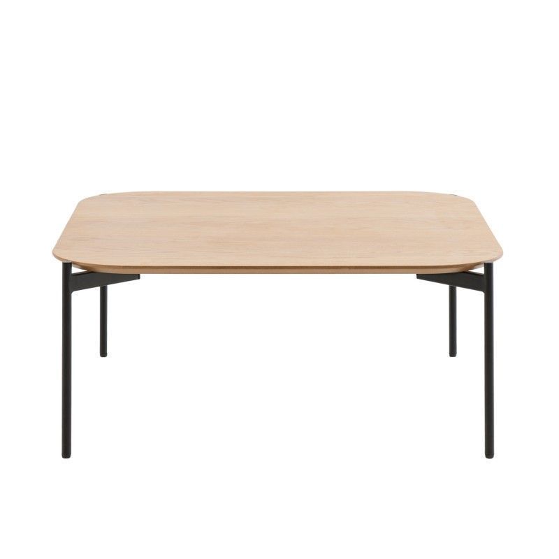 Mesa de centro quadrada, com cantos curvos de design moderno. Em carvalho com pés em metal preto.