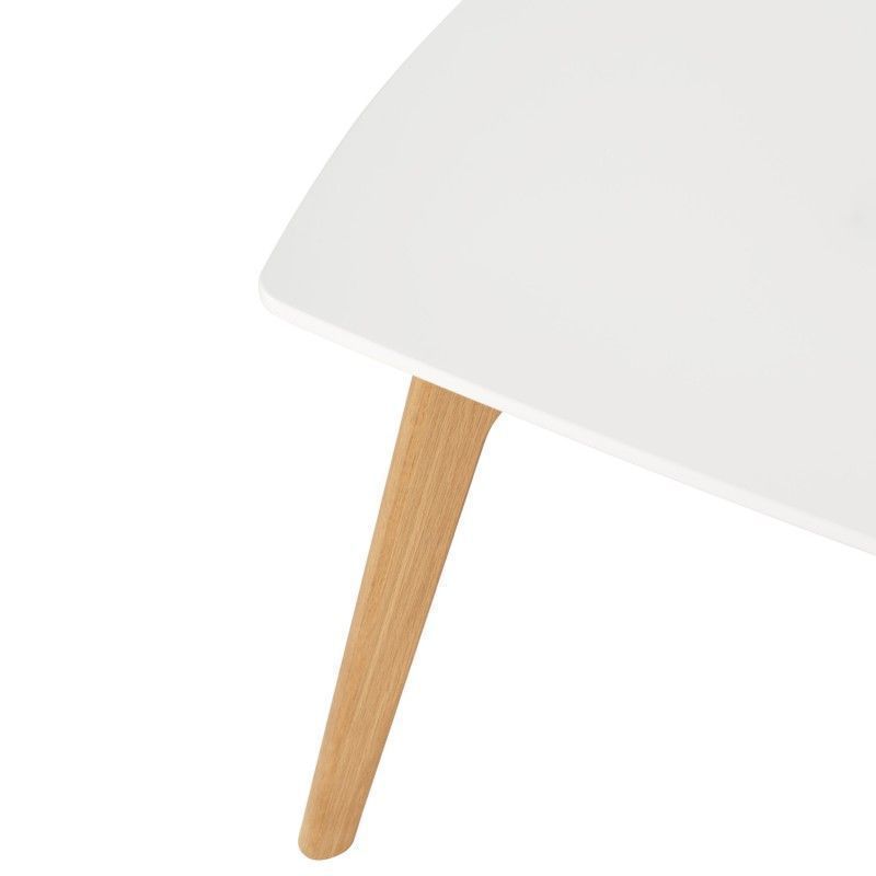 Mesa de centro retangular em madeira, cor branca e pés com acabamento em carvalho.