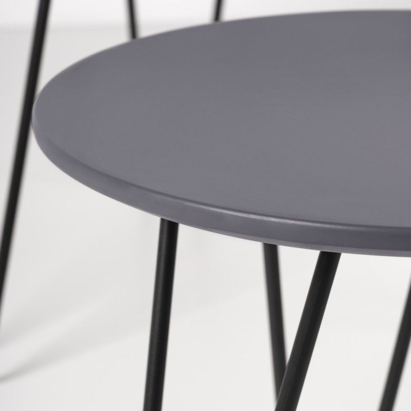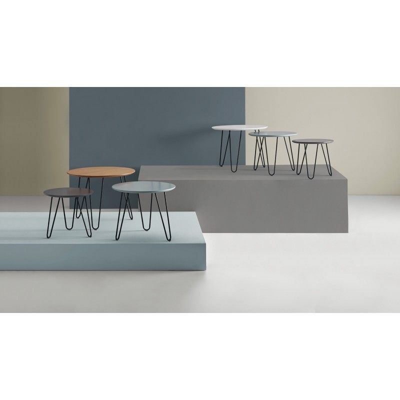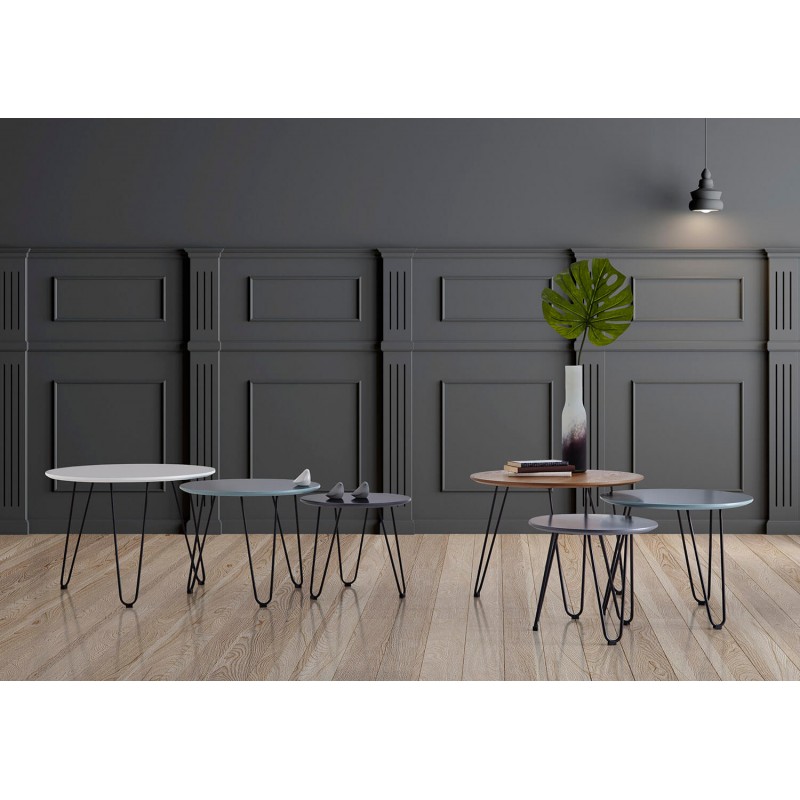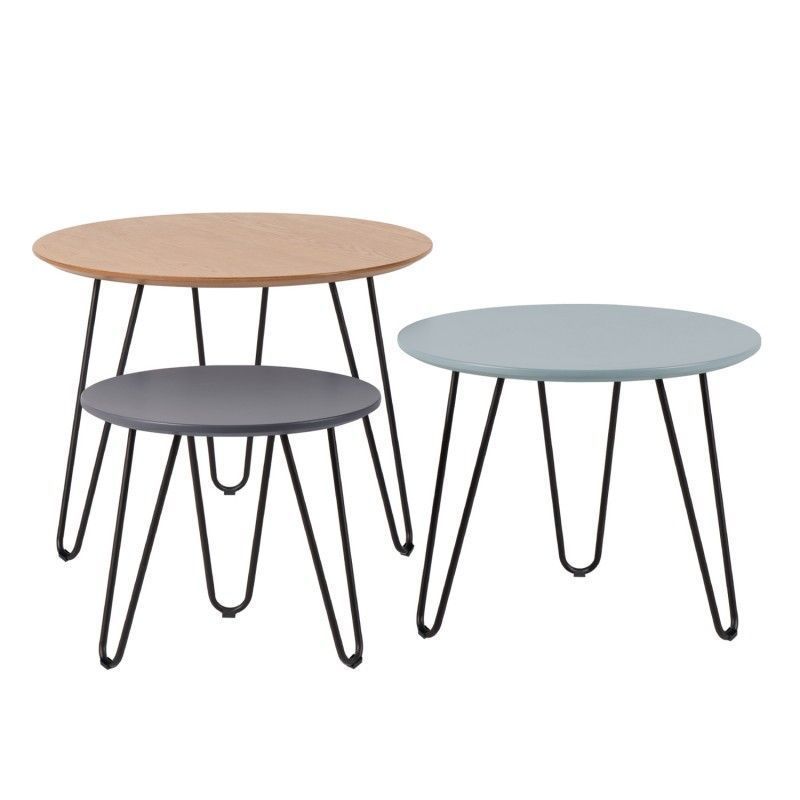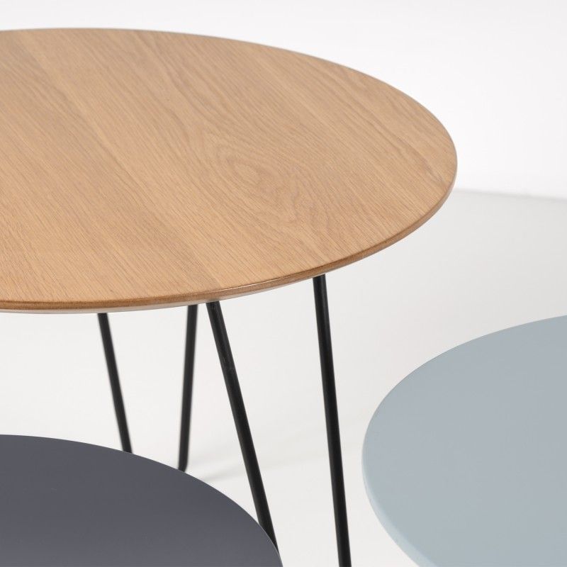 Conjunto de mesas de centro redondas com tampo em madeira de carvalho, azul, cinzento escuro e pés em metal preto. Conjunto de mesas em diferentes alturas com uma estética moderna e casual.