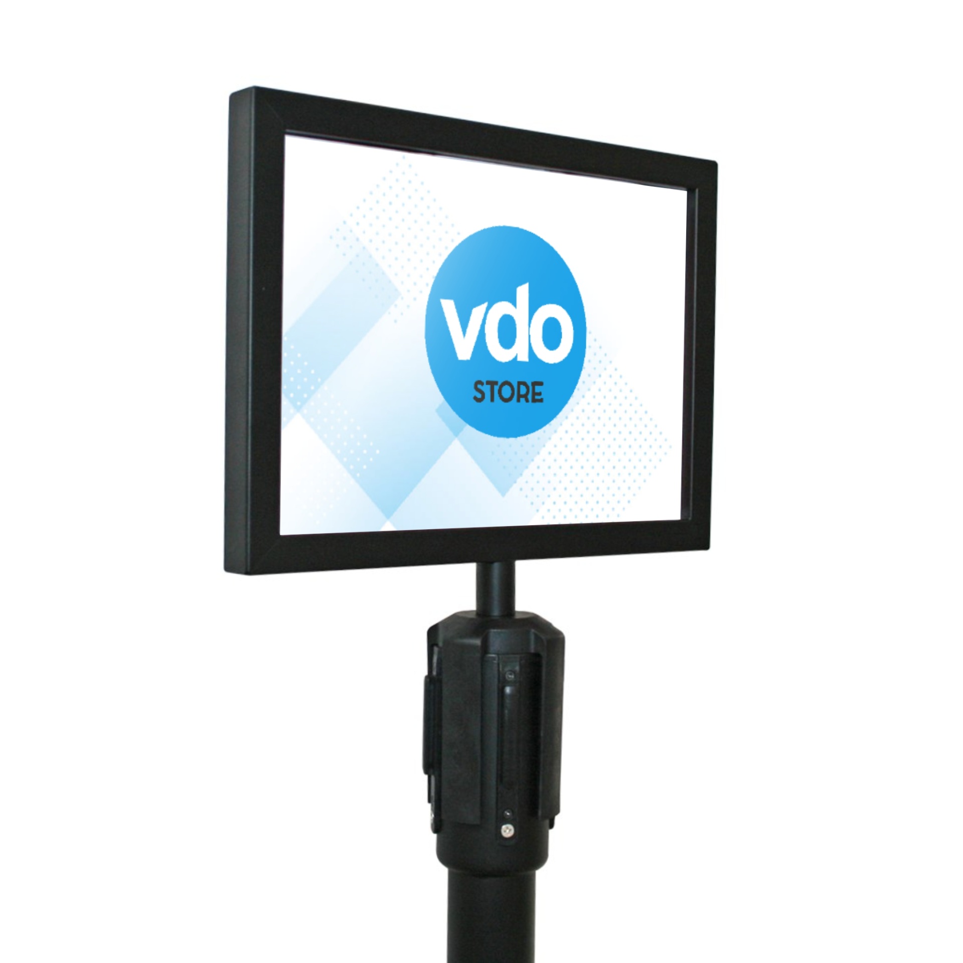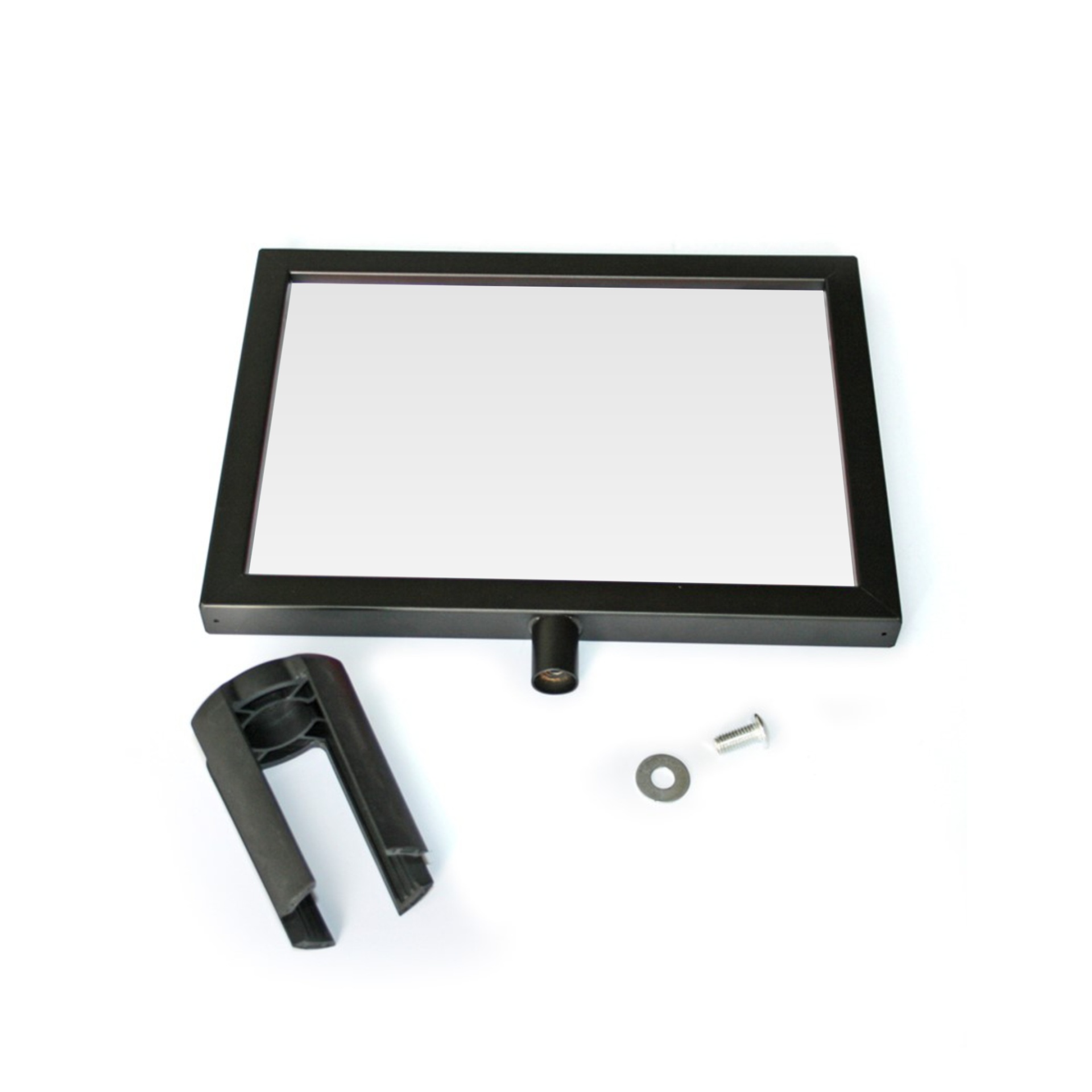 Porta Cartaz A4 com orientação horizontal em ferro e acabamento lacado preto.
