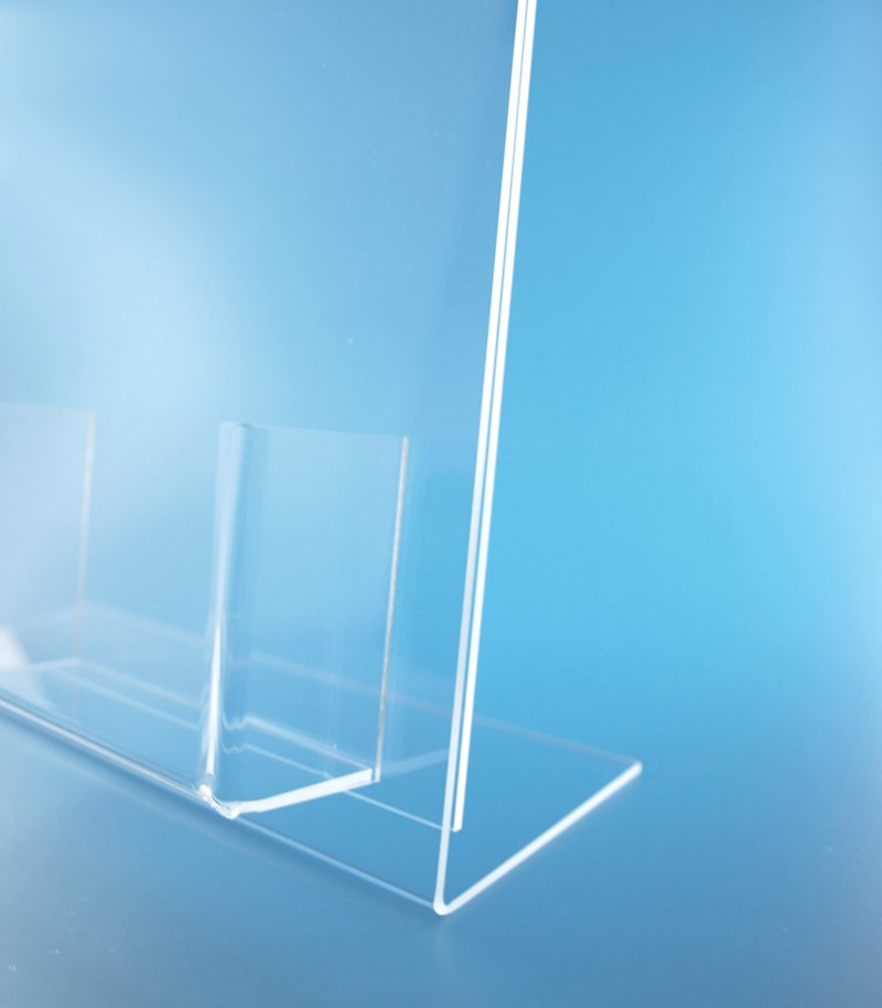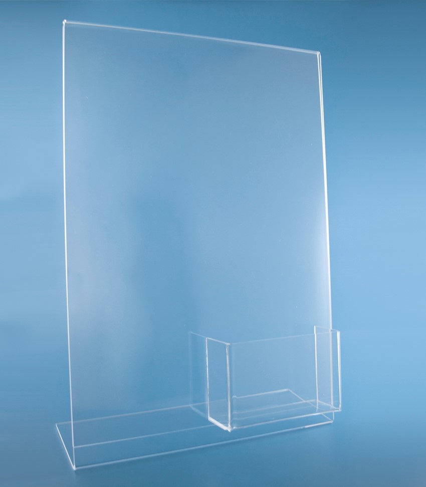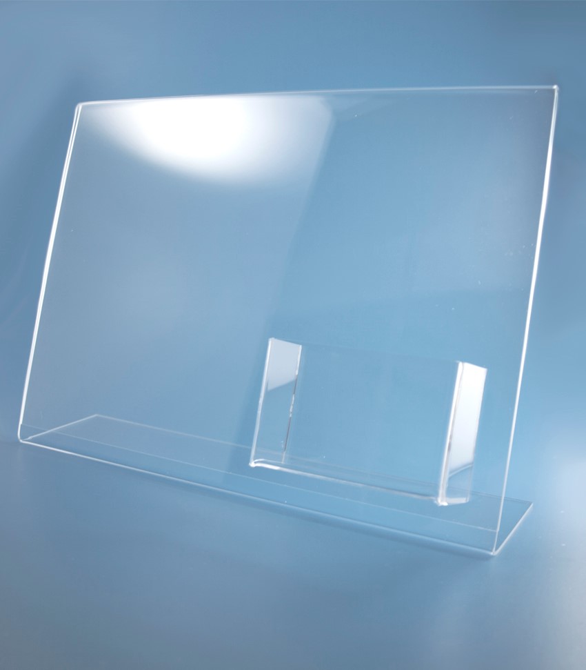 O Porta-Menu de acrílico apresenta uma forma de “L” e permite a divulgação extra de cartões de visita.