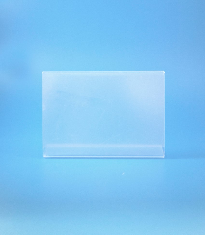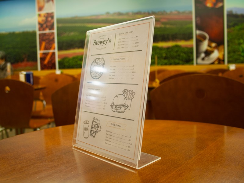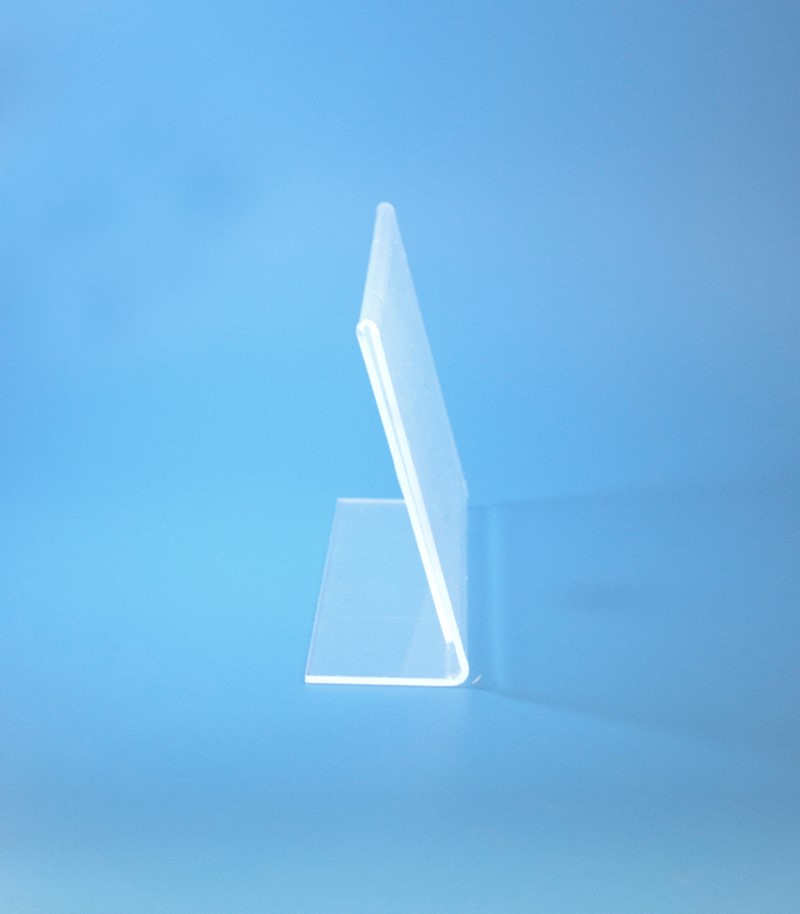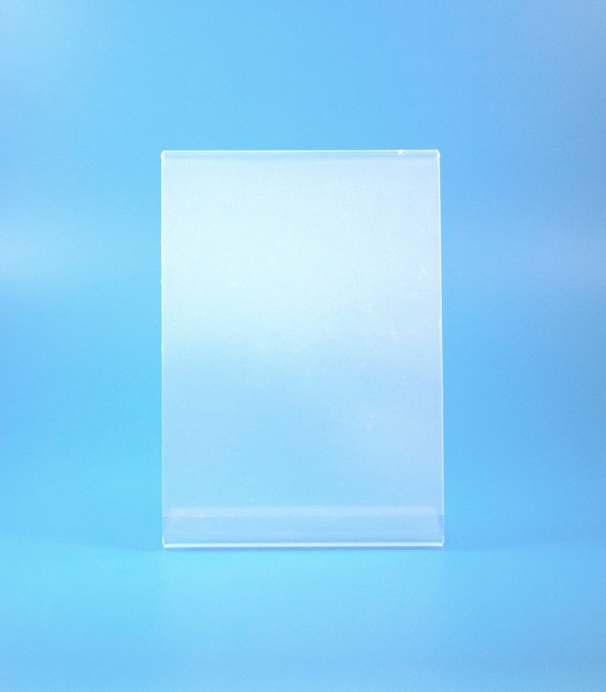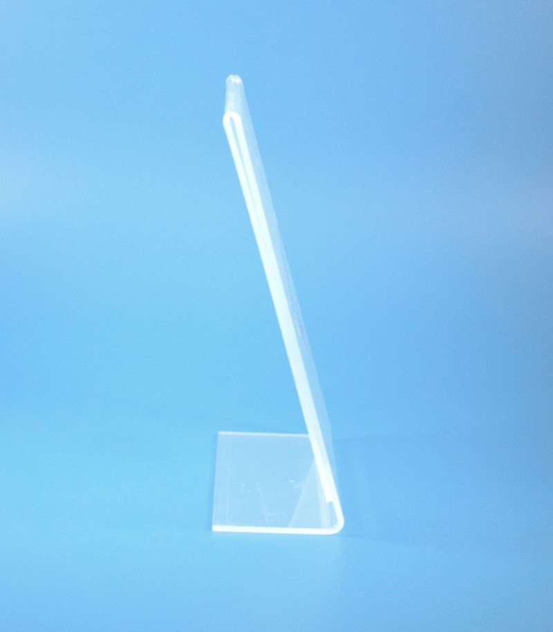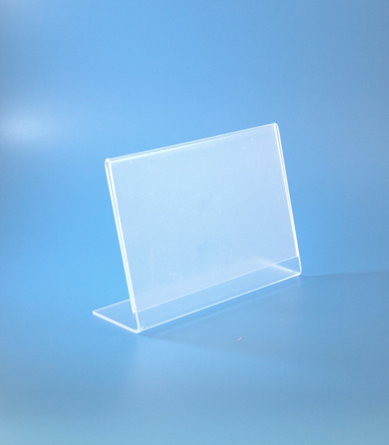 O Porta-Menu de acrílico apresenta uma forma de “L”.