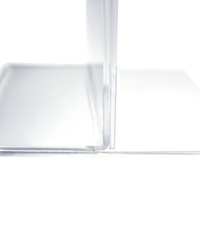 Este expositor encontra-se disponível em diversos formatos diferentes e está desenhado para colocar a imagem promocional e as duas faces serem visíveis. A colocação da imagem promocional é muito fácil, pois é colocada pelas laterais ou pela parte inferior do acrílico.