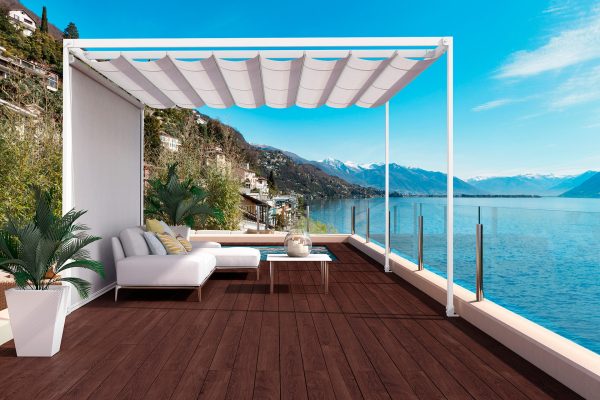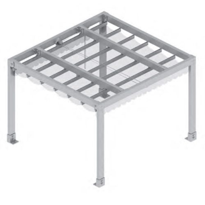 A estrutura é construída em alumínio lacado e suporta as guias de deslocamento por onde deslizam travessas ou barras de suporte de duplo macarrão que sustentam as varas da lona e permitem a abertura e fecho do toldo através de cordas e polias, ou com um sistema de correias de transmissão integrado nas guias acionadas por motor.