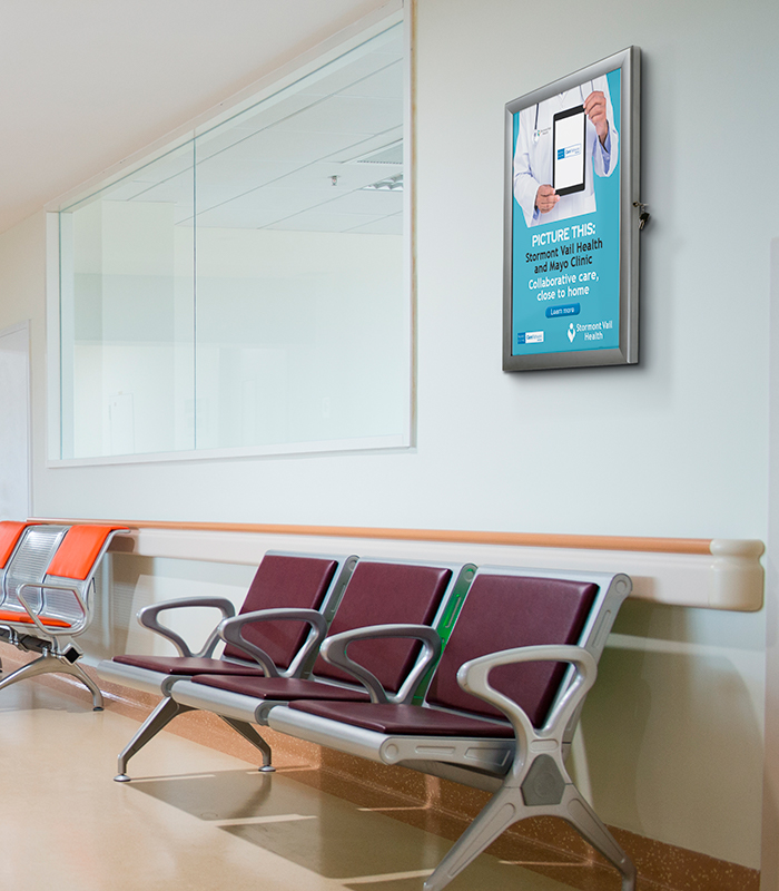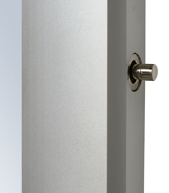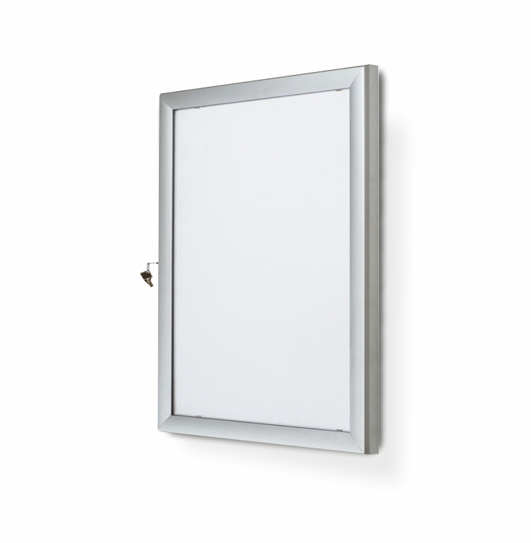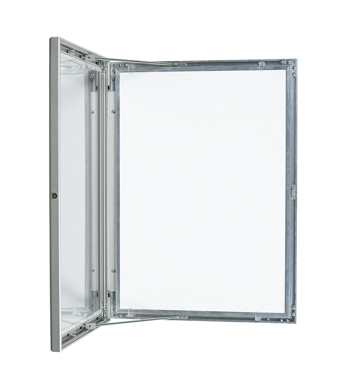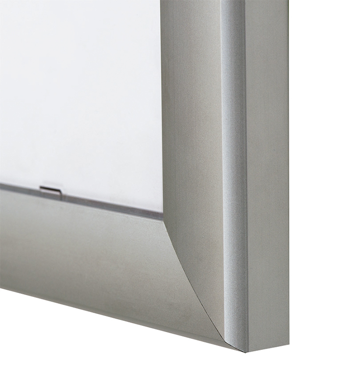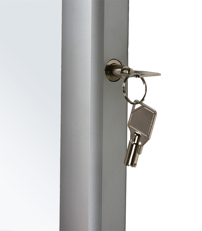 O perfil tem uma espessura de 27 mm e uma largura de 35,5 mm com fechadura lateral. Ideal para espaços públicos já que o que se expõe fica protegido pela fechadura. A mudança de imagens é rápida e fácil graças à sua janela articulada e aos clipes que a prendem.
